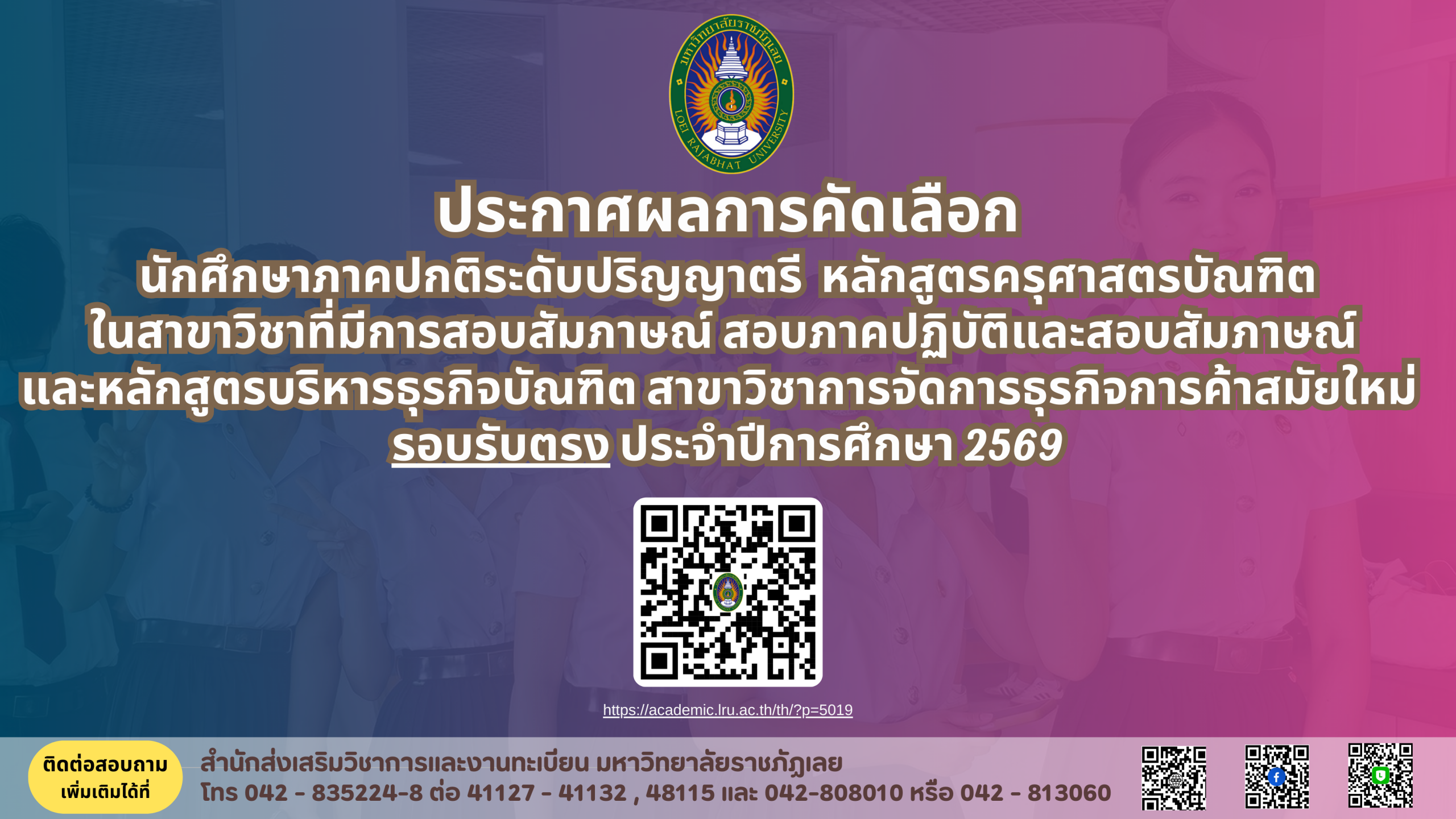 ตามที่มหาวิทยาลัยราชภัฏเลย ได้ประกาศรายชื่อผู้มีสิทธิ์สอบสัมภาษณ์ สอบภาคปฏิบัติและสอบสัมภาษณ์ เพื่อคัดเลือกเข้าศึกษาในหลักสูตรครุศาสตรบัณฑิต และหลักสูตรบริหารธุรกิจบัณฑิต สาขาวิชาการจัดการธุรกิจการค้าสมัยใหม่ ระดับปริญญาตรี รอบรับตรง ประจำปีการศึกษา 2569 และได้ดำเนินการสอบสัมภาษณ์ สอบภาคปฏิบัติและสอบสัมภาษณ์ ในวันที่ 25 มกราคม 2569 นั้น บัดนี้ มหาวิทยาลัยได้ดำเนินการเสร็จเรียบร้อยแล้ว อาศัยอำนาจตามความในมาตรา 31 แห่งพระราชบัญญัติมหาวิทยาลัยราชภัฏ พ.ศ. 2547 มหาวิทยาลัยจึงประกาศรายชื่อผู้ที่ได้รับการคัดเลือกตามบัญชีรายชื่อและเอกสารไฟล์แนบท้ายประกาศ โดยให้ผู้ที่ได้รับการคัดเลือกดำเนินการดังไฟล์แนบต่อไปนี้