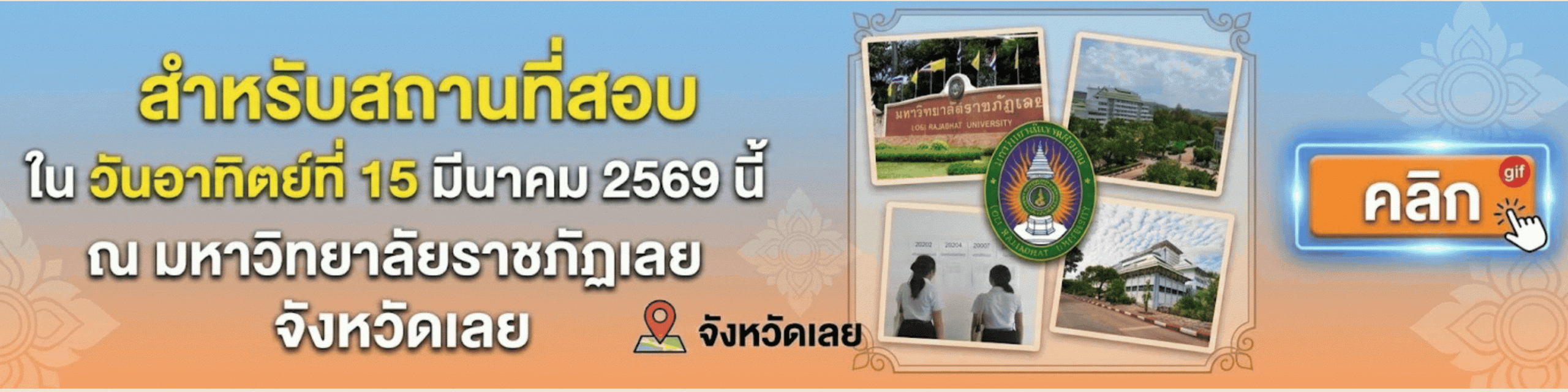 ตามที่มหาวิทยาลัยราชภัฏเลย ได้ดำเนินการรับสมัครนักศึกษาใหม่ ภาคปกติ ระดับปริญญาตรี รอบทั่วไป ประจำปีการศึกษา 2569 ในระหว่างวันที่ 3 กุมภาพันธ์ 2569 – 2 มีนาคม 2569 เพื่อคัดเลือกเข้าศึกษาต่อในมหาวิทยาลัยราชภัฏเลย บัดนี้ ได้สิ้นสุดการรับสมัครแล้ว อาศัยอำนาจตามความในมาตรา 31 แห่งพระราชบัญญัติมหาวิทยาลัยราชภัฏ พ.ศ. 2547 มหาวิทยาลัยจึงประกาศรายชื่อผู้สมัครเข้าเป็นนักศึกษา (ตามสาขาวิชาที่เลือกเป็นลำดับที่ 1) และรายละเอียดของการคัดเลือกนักศึกษาภาคปกติ ระดับปริญญาตรี รอบทั่วไป ประจำปีการศึกษา 2569 ดังนี้